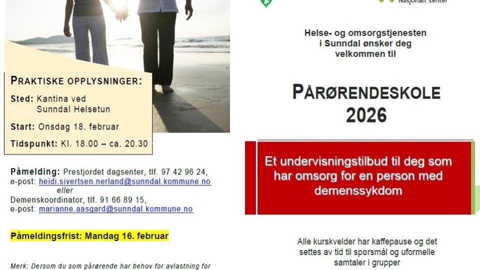 Pårørendeskole Onsdag 18. februar starter pårørendeskolen 2026 på igjen: Se informasjon om dette i brosjyren under: Publisert 16.02.2026 kl. 09:55