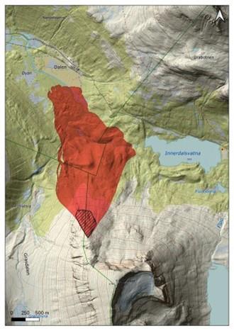 Kartet viser området som kan bli utsett for skred frå Skarfjellet (markert i raudt). Det svarte skraverte området er losneområdet. Kommunen og NVE rådar folk til å ikkje ferdast innanfor det raude området inntil vidare.NVE har overvaka Skarfjellet med radar sidan 14. juli, etter at Sunndal kommune melde at det har vore mange steinsprang frå fjellsida på våren og sommaren. Radaren måler overflaterørsler i fjellsida, og kan gi verdifull kunnskap om dette fjellpartiet og om fjellskred generelt.