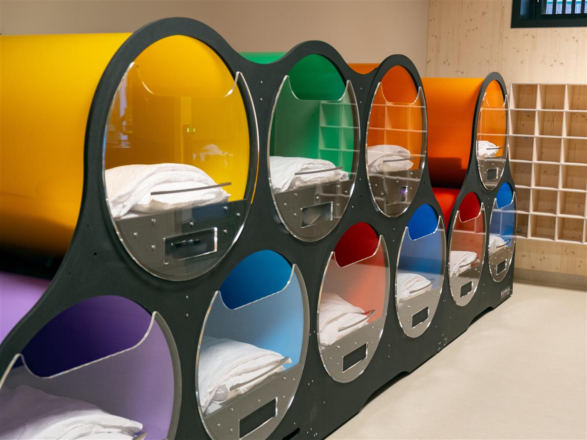 Dørene til avdelingene er markert med tall og egne fargerTil sammen er de 138 barna fordelt på 8 avdelinger som er lett gjenkjennbare med tallet og fargen til avdelingen på døra. Avdelingene har én avdeling de vil samarbeide og være litt mer sammen med. De to avdelingene som samarbeider deler da kjøkken, som ligger plassert mellom de to avdelingene.