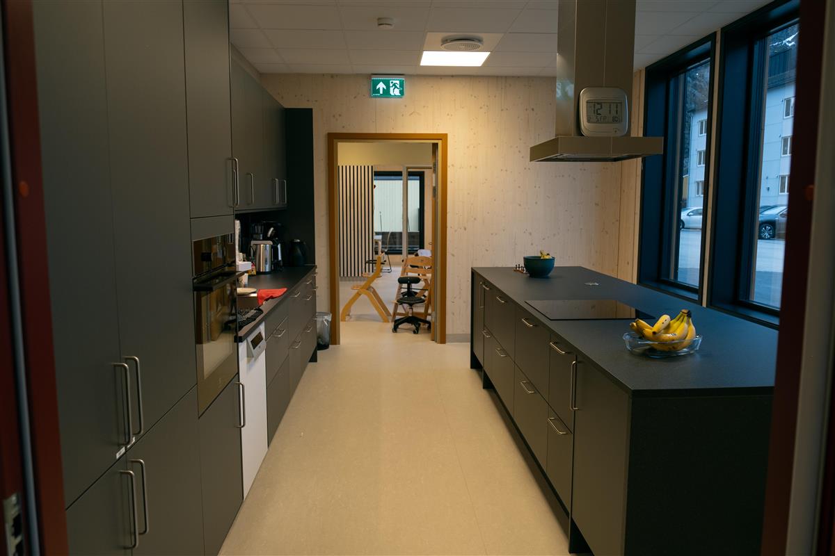 Kjøkkenen mellom to avdelinger, med opphøyd gulv på baksiden så barna kan deltaDet er en historisk dag i Sunndal kommune sin historie. Barnehagen er det største byggeprosjektet i kommunens historie så langt, og nå har den endelig blitt fylt med barn og ansatte. Så håper vi den kommer alle innbyggere i Sunndal kommune til gode i årene som kommer.