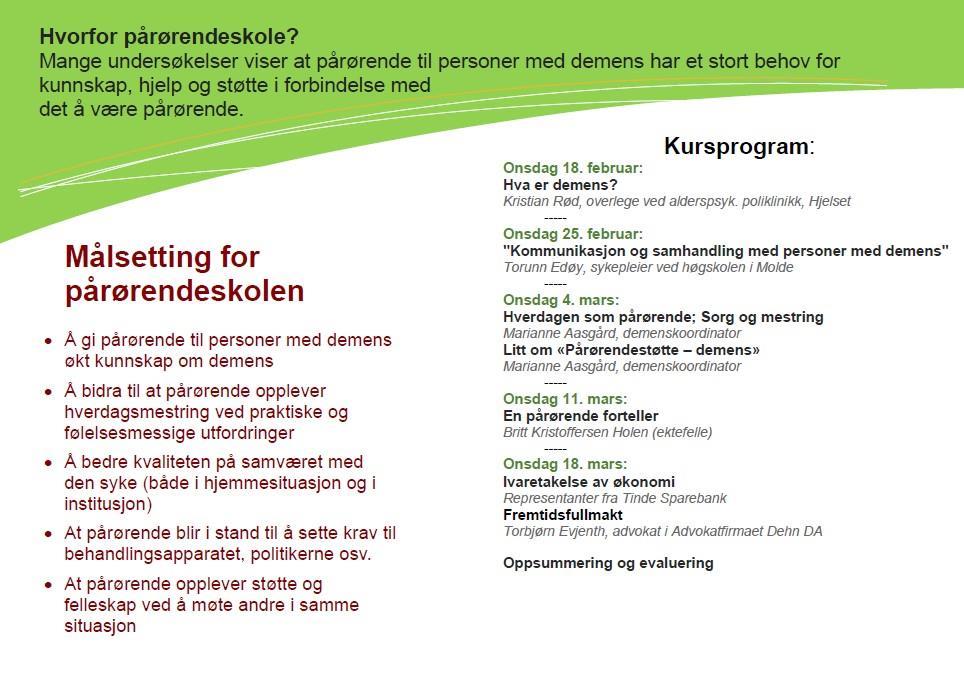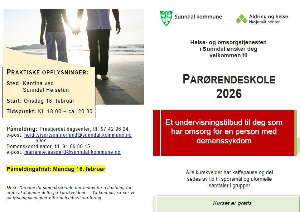 PårørendeskoleOnsdag 18. februar starter pårørendeskolen 2026 på igjen: Se informasjon om dette i brosjyren under:Pårørendeskole 2026pårørendeskoleside2 Sist endret 16.02.2026 13:24