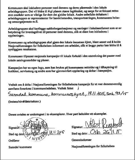 Sunndal kommune har siden 2015 hatt et tydelig politisk mål om å være et foregangseksempel som et demensvennlig samfunn. Det ble i 2015 underskrevet avtale med nasjonalforeningen for folkehelse: