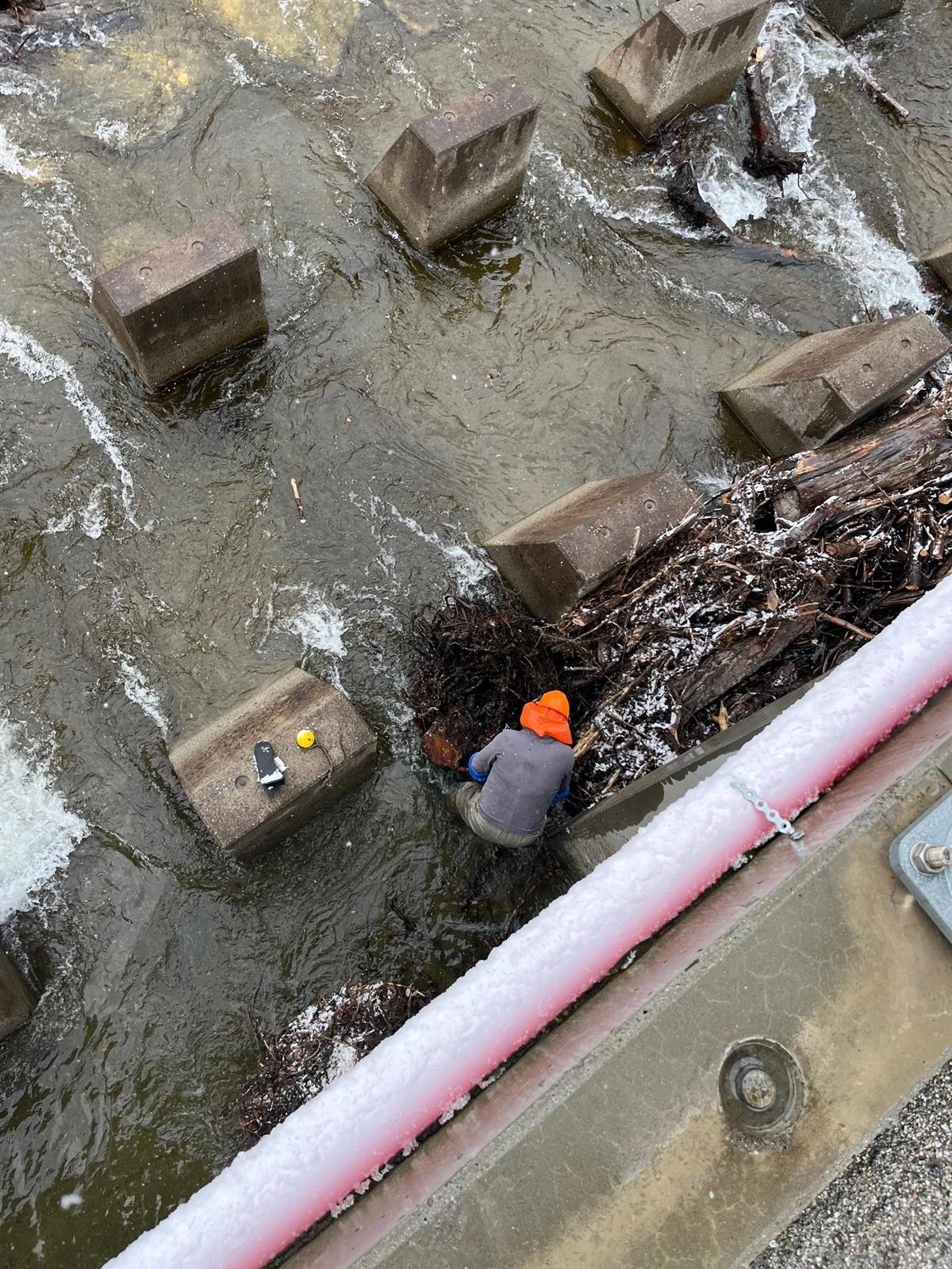 Ellers har Esben og Roald sagd opp og fjernet trerasket som har stått fast i bølgedemperne etter at de kom på rista i fjor. En utrolig stor jobb, som det var fint å få til nå når det er så lite vann i elva. Heldigvis er vaderne så store at man får motorsagbukse under! Jeg og Roald har tatt en runde med tre og krattrydding rundt sperra og fått frakta det frostsikrede utstyret tilbake til JG, slik at rørlegger kan montere det. Bildene i bildekarusellene er tatt av meg, Roald Negård og Egil Magne Harstad.